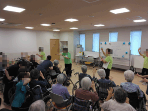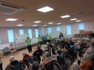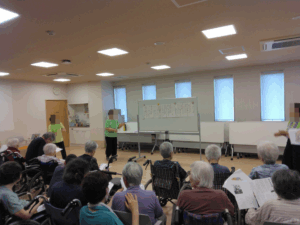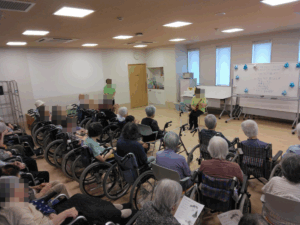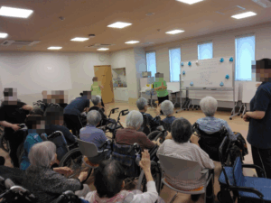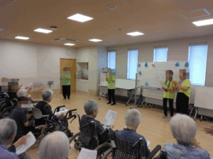 9月8日(月)にボランティアの「クローバー」さんにきていただき、始めはじゃんけんゲームを入居者さんとしていただき、その後に何曲か懐メロを入居者さんと一緒に歌っていただきました☺