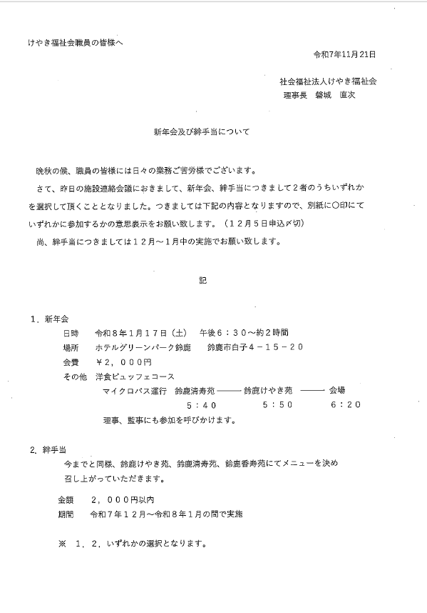 理事、監事の皆様の参加もあり、職員間の交流もなされ、有意義なひとときを持つことができた。